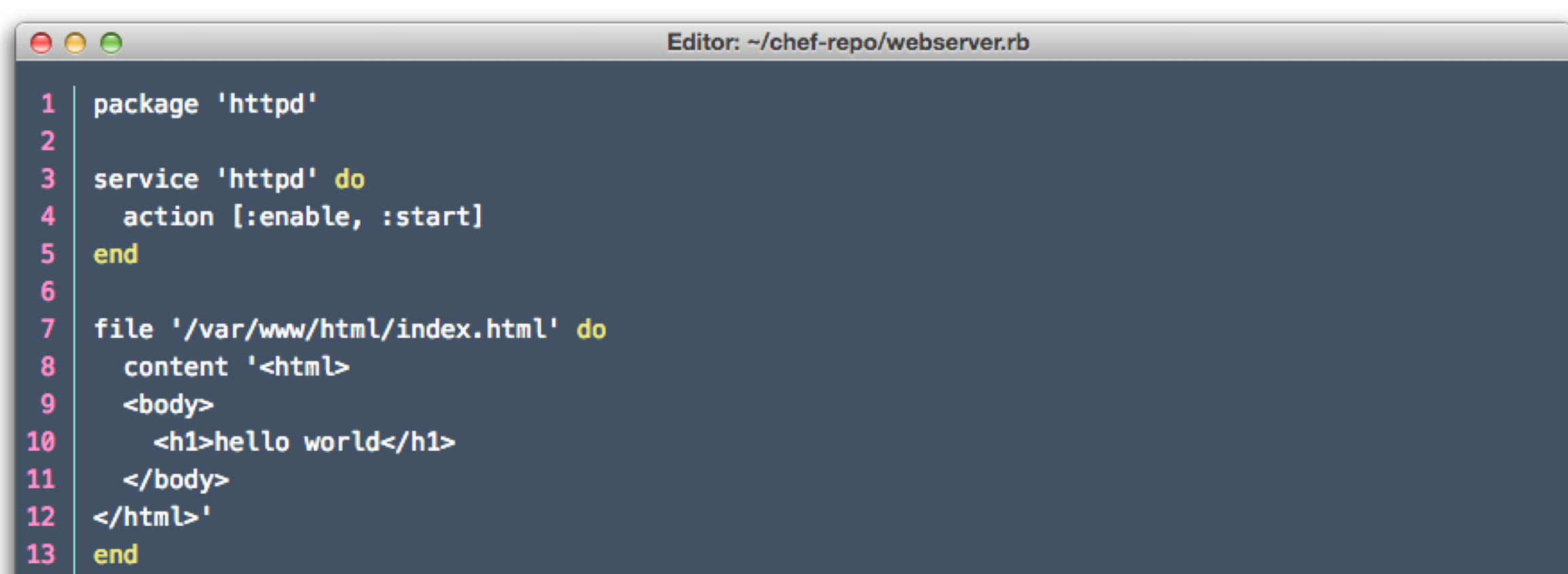 In this simple webserver.rb recipe from the Learn Chef website, we use 3 resources: package, service, and file. These resources describe everything needed to stand up an apache web server, have it run at boot time, and have it serve a simple "hello world" page.